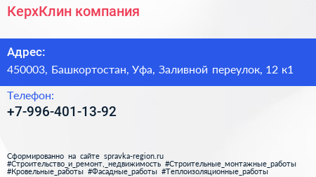 КерхКлин, компания по адресу 450003, Башкортостан, Уфа, Заливной переулок, 12 к1 в дальнейшем Организация, размещена в следующих категориях: