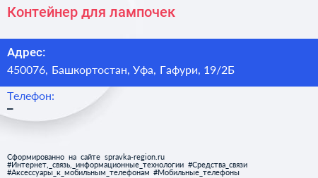 Контейнер для лампочек по адресу 450076, Башкортостан, Уфа, Гафури, 19/2Б в дальнейшем Организация, размещена в следующих категориях: