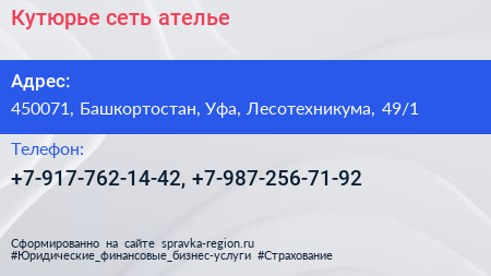 Кутюрье, сеть ателье по адресу 450071, Башкортостан, Уфа, Лесотехникума, 49/1 в дальнейшем Организация, размещена в следующих категориях: