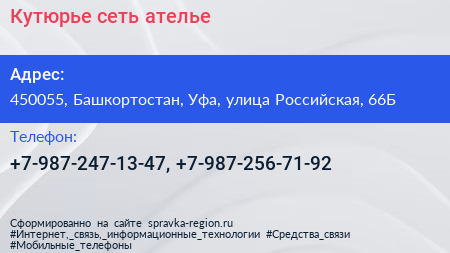 Кутюрье, сеть ателье по адресу 450055, Башкортостан, Уфа, улица Российская, 66Б в дальнейшем Организация, размещена в следующих категориях: