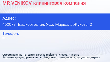MR.VENIKOV, клининговая компания по адресу 450073, Башкортостан, Уфа, Маршала Жукова, 2 в дальнейшем Организация, размещена в следующих категориях: