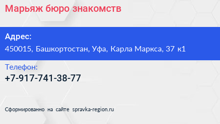Марьяж, бюро знакомств по адресу 450015, Башкортостан, Уфа, Карла Маркса, 37 к1 в дальнейшем Организация, размещена в следующих категориях: