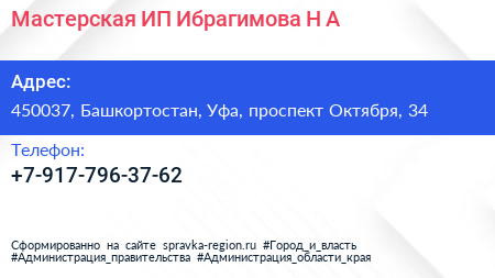 Мастерская, ИП Ибрагимова Н.А. по адресу 450037, Башкортостан, Уфа, проспект Октября, 34 в дальнейшем Организация, размещена в следующих категориях: