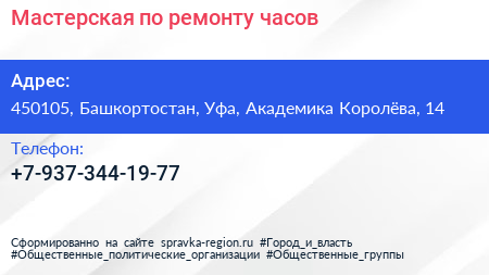 Мастерская по ремонту часов по адресу 450105, Башкортостан, Уфа, Академика Королёва, 14 в дальнейшем Организация, размещена в следующих категориях: