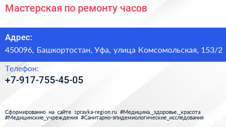 Мастерская по ремонту часов по адресу 450096, Башкортостан, Уфа, улица Комсомольская, 153/2 в дальнейшем Организация, размещена в следующих категориях: