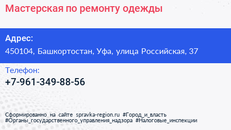 Мастерская по ремонту одежды по адресу 450104, Башкортостан, Уфа, улица Российская, 37 в дальнейшем Организация, размещена в следующих категориях:
