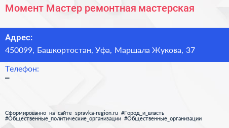 Момент Мастер, ремонтная мастерская по адресу 450099, Башкортостан, Уфа, Маршала Жукова, 37 в дальнейшем Организация, размещена в следующих категориях:
