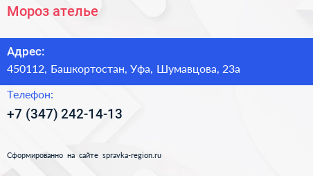 Мороз, ателье по адресу 450112, Башкортостан, Уфа, Шумавцова, 23а в дальнейшем Организация, размещена в следующих категориях: