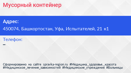 Мусорный контейнер по адресу 450074, Башкортостан, Уфа, Испытателей, 21 к1 в дальнейшем Организация, размещена в следующих категориях: