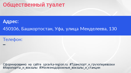 Общественный туалет по адресу 450106, Башкортостан, Уфа, улица Менделеева, 130 в дальнейшем Организация, размещена в следующих категориях: