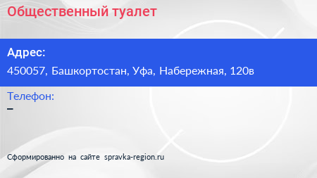Общественный туалет по адресу 450057, Башкортостан, Уфа, Набережная, 120в в дальнейшем Организация, размещена в следующих категориях: