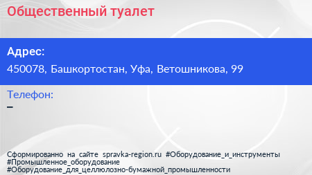 Общественный туалет по адресу 450078, Башкортостан, Уфа, Ветошникова, 99 в дальнейшем Организация, размещена в следующих категориях: