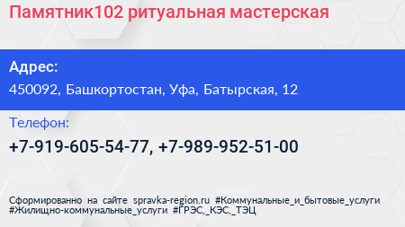 Памятник102, ритуальная мастерская по адресу 450092, Башкортостан, Уфа, Батырская, 12 в дальнейшем Организация, размещена в следующих категориях: