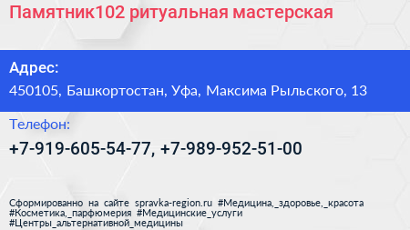Памятник102, ритуальная мастерская по адресу 450105, Башкортостан, Уфа, Максима Рыльского, 13 в дальнейшем Организация, размещена в следующих категориях: