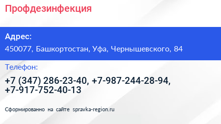 Профдезинфекция по адресу 450077, Башкортостан, Уфа, Чернышевского, 84 в дальнейшем Организация, размещена в следующих категориях: