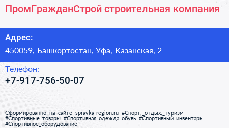 ПромГражданСтрой, строительная компания по адресу 450059, Башкортостан, Уфа, Казанская, 2 в дальнейшем Организация, размещена в следующих категориях: