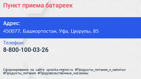 Пункт приема батареек по адресу 450077, Башкортостан, Уфа, Цюрупы, 85 в дальнейшем Организация, размещена в следующих категориях: