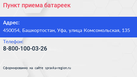 Пункт приема батареек по адресу 450054, Башкортостан, Уфа, улица Комсомольская, 135 в дальнейшем Организация, размещена в следующих категориях: