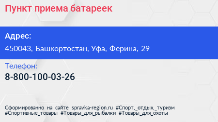 Пункт приема батареек по адресу 450043, Башкортостан, Уфа, Ферина, 29 в дальнейшем Организация, размещена в следующих категориях: