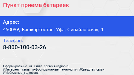Пункт приема батареек по адресу 450099, Башкортостан, Уфа, Сипайловская, 1 в дальнейшем Организация, размещена в следующих категориях: