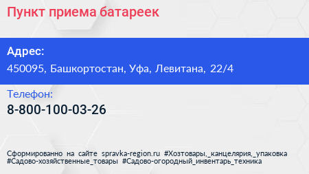 Пункт приема батареек по адресу 450095, Башкортостан, Уфа, Левитана, 22/4 в дальнейшем Организация, размещена в следующих категориях: