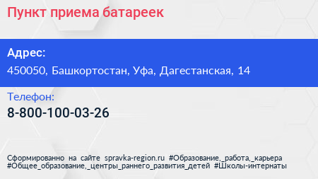 Пункт приема батареек по адресу 450050, Башкортостан, Уфа, Дагестанская, 14 в дальнейшем Организация, размещена в следующих категориях: