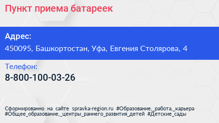 Пункт приема батареек по адресу 450095, Башкортостан, Уфа, Евгения Столярова, 4 в дальнейшем Организация, размещена в следующих категориях: