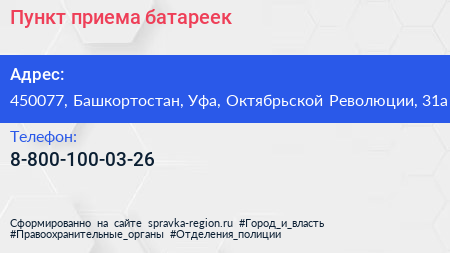 Пункт приема батареек по адресу 450077, Башкортостан, Уфа, Октябрьской Революции, 31а в дальнейшем Организация, размещена в следующих категориях: