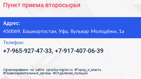 Пункт приема второсырья по адресу 450069, Башкортостан, Уфа, бульвар Молодёжи, 1а в дальнейшем Организация, размещена в следующих категориях: