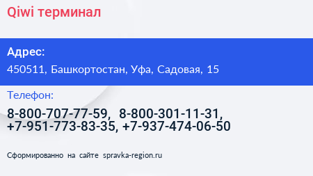 Qiwi, терминал по адресу 450511, Башкортостан, Уфа, Садовая, 15 в дальнейшем Организация, размещена в следующих категориях:
