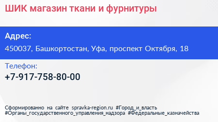 ШИК, магазин ткани и фурнитуры по адресу 450037, Башкортостан, Уфа, проспект Октября, 18 в дальнейшем Организация, размещена в следующих категориях: