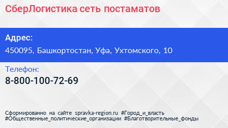СберЛогистика, сеть постаматов по адресу 450095, Башкортостан, Уфа, Ухтомского, 10 в дальнейшем Организация, размещена в следующих категориях: