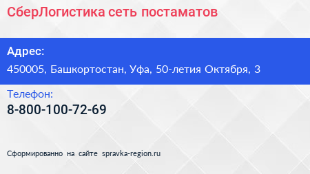 СберЛогистика, сеть постаматов по адресу 450005, Башкортостан, Уфа, 50-летия Октября, 3 в дальнейшем Организация, размещена в следующих категориях: