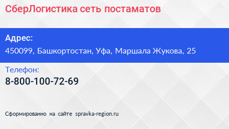 СберЛогистика, сеть постаматов по адресу 450099, Башкортостан, Уфа, Маршала Жукова, 25 в дальнейшем Организация, размещена в следующих категориях: