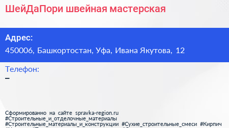 ШейДаПори, швейная мастерская по адресу 450006, Башкортостан, Уфа, Ивана Якутова, 12 в дальнейшем Организация, размещена в следующих категориях:
