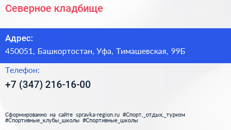 Северное кладбище по адресу 450051, Башкортостан, Уфа, Тимашевская, 99Б в дальнейшем Организация, размещена в следующих категориях: