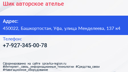 Шик, авторское ателье по адресу 450022, Башкортостан, Уфа, улица Менделеева, 137 к4 в дальнейшем Организация, размещена в следующих категориях: