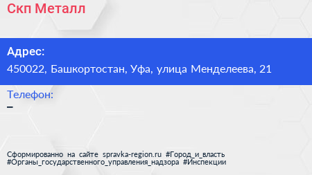 Скп-Металл по адресу 450022, Башкортостан, Уфа, улица Менделеева, 21 в дальнейшем Организация, размещена в следующих категориях:
