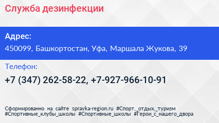 Служба дезинфекции по адресу 450099, Башкортостан, Уфа, Маршала Жукова, 39 в дальнейшем Организация, размещена в следующих категориях: