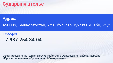 Сударыня, ателье по адресу 450039, Башкортостан, Уфа, бульвар Тухвата Янаби, 71/1 в дальнейшем Организация, размещена в следующих категориях: