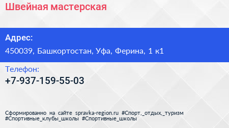 Швейная мастерская по адресу 450039, Башкортостан, Уфа, Ферина, 1 к1 в дальнейшем Организация, размещена в следующих категориях: