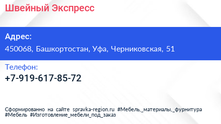 Швейный Экспресс по адресу 450068, Башкортостан, Уфа, Черниковская, 51 в дальнейшем Организация, размещена в следующих категориях: