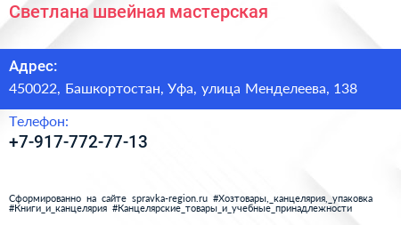 Светлана, швейная мастерская по адресу 450022, Башкортостан, Уфа, улица Менделеева, 138 в дальнейшем Организация, размещена в следующих категориях:
