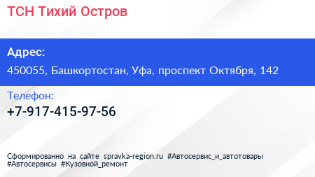 ТСН Тихий Остров по адресу 450055, Башкортостан, Уфа, проспект Октября, 142 в дальнейшем Организация, размещена в следующих категориях: