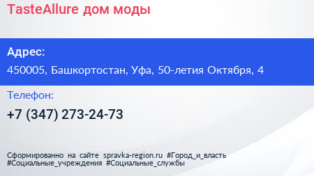 TasteAllure, дом моды по адресу 450005, Башкортостан, Уфа, 50-летия Октября, 4 в дальнейшем Организация, размещена в следующих категориях: