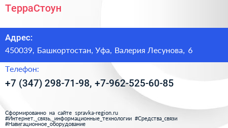 ТерраСтоун по адресу 450039, Башкортостан, Уфа, Валерия Лесунова, 6 в дальнейшем Организация, размещена в следующих категориях: