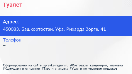 Туалет по адресу 450083, Башкортостан, Уфа, Рихарда Зорге, 41 в дальнейшем Организация, размещена в следующих категориях: