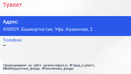 Туалет по адресу 450059, Башкортостан, Уфа, Казанская, 2 в дальнейшем Организация, размещена в следующих категориях: