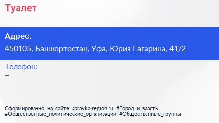 Туалет по адресу 450105, Башкортостан, Уфа, Юрия Гагарина, 41/2 в дальнейшем Организация, размещена в следующих категориях: