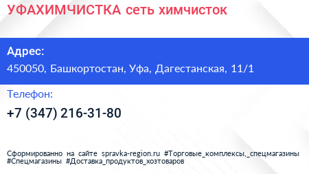 УФАХИМЧИСТКА, сеть химчисток по адресу 450050, Башкортостан, Уфа, Дагестанская, 11/1 в дальнейшем Организация, размещена в следующих категориях: